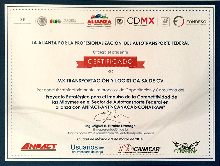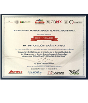 - Reconocimiento de La Alianza por la Profesianalización del Autotransporte Federal.
